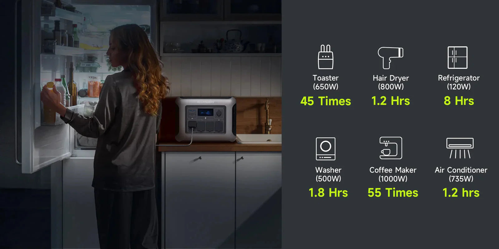 Наприклад, якщо R1500 LITE використовується для живлення портативного охолоджувача потужністю 120 Вт, час роботи складатиме 1056 Вт·год * 85% / 120 Вт ≈ 6 годин.