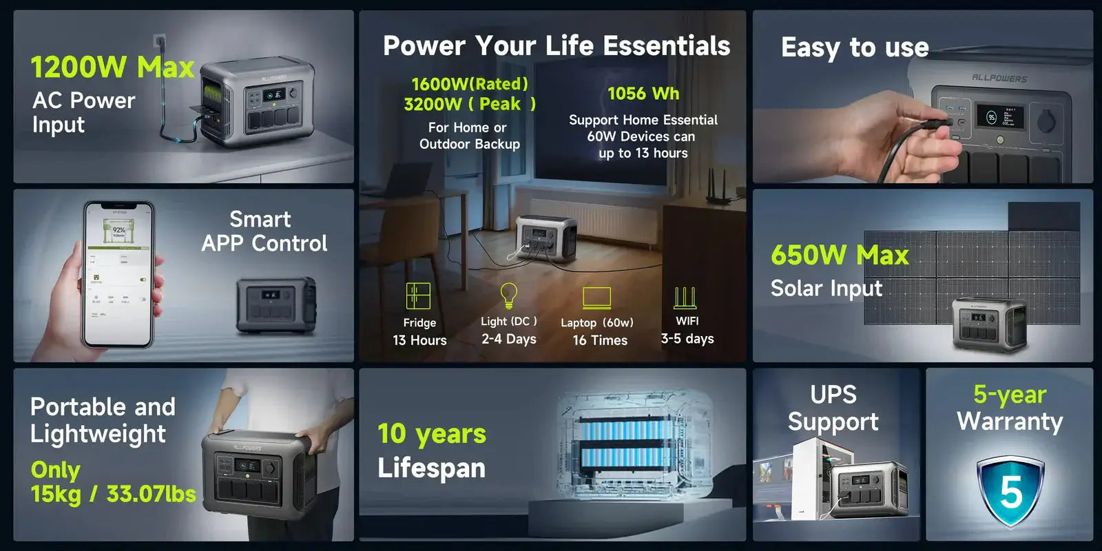 R1500 LITE має вихід змінного струму 1600 Вт (пікова потужність 3200 Вт), що дозволяє живити більшість побутових і зовнішніх електроприладів потужністю до 1600 Вт, таких як ноутбуки, телевізори, міні-холодильники, дрони, проектори, кавоварки, апарати CPAP і навіть електроінструменти.