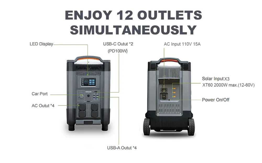 ALLPOWERS R4000 оснащений звичайним вихідним портом і аварійним вихідним портом. Вихідний порт AC x 4, вихідний порт USB-C (до 100 Вт) x 2, вихідний порт USB-A (до 18 Вт) x 2, вихідний порт USB-A (до 12 Вт) x 2, вихідний порт прикурювача (максимум 120 Вт) x 1, вихідний порт RV x 1. Під час сімейного кемпінгу або заходу на свіжому повітрі ви можете заряджати пристрої всіх одночасно, якщо у вас є.