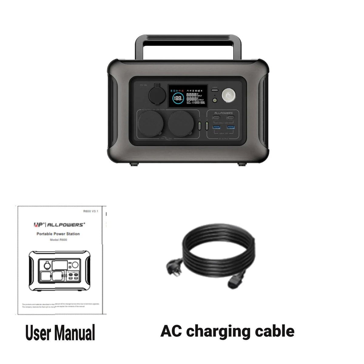 Портативна електростанція ALLPOWERS має 2 розетки змінного струму (220 В-240 В 600 Вт, 1200 Вт пікова потужність), 2 порти USB-C, 2 порти USB-A, 1 автомобільний прикурювач (12 В/10 А) і бездротовий зарядний пристрій потужністю 15 Вт. З потужністю до 600 Вт, зовнішній генератор ALLPOWERS R600 спеціально розроблений для заряджання чайників, соковижималок, ноутбуків, автомобільних холодильників, дронів та інших зовнішніх електронних пристроїв, забезпечуючи безтурботне живлення ваших пригод на свіжому повітрі.