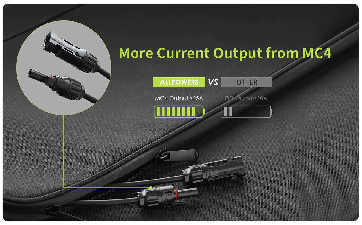 Портативна сонячна панель ALLPOWERS 200 Вт має ефективність до 22% і на 1/3 легша за сонячні панелі з кремнію такої ж потужності. Потужність 200 Вт забезпечує більшу потужність для ваших пристроїв і швидше заряджає їх.
